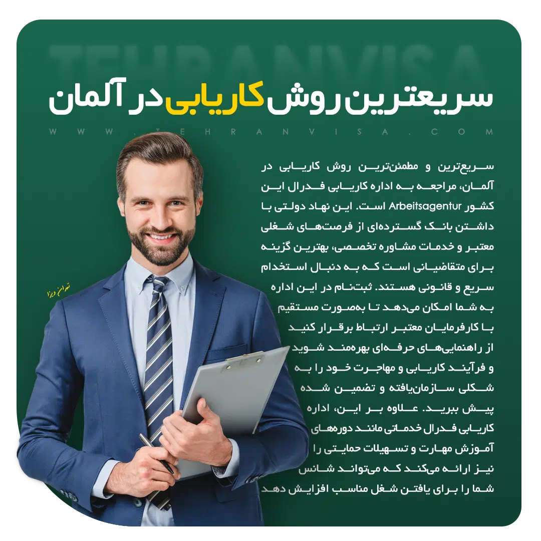 سریع‌ترین و مطمئن‌ترین روش کاریابی در آلمان، مراجعه به اداره کاریابی فدرال این کشور (Arbeitsagentur) است. این نهاد دولتی با داشتن بانک گسترده‌ای از فرصت‌های شغلی معتبر و خدمات مشاوره تخصصی، بهترین گزینه برای متقاضیانی است که به دنبال استخدام سریع و قانونی هستند. ثبت‌نام در این اداره به شما امکان می‌دهد تا به‌صورت مستقیم با کارفرمایان معتبر ارتباط برقرار کنید، از راهنمایی‌های حرفه‌ای بهره‌مند شوید و فرآیند کاریابی و مهاجرت خود را به شکلی سازمان‌یافته و تضمین شده پیش ببرید. علاوه بر این، اداره کاریابی فدرال خدماتی مانند دوره‌های آموزش مهارت و تسهیلات حمایتی را نیز ارائه می‌کند که می‌تواند شانس شما را برای یافتن شغل مناسب افزایش دهد.