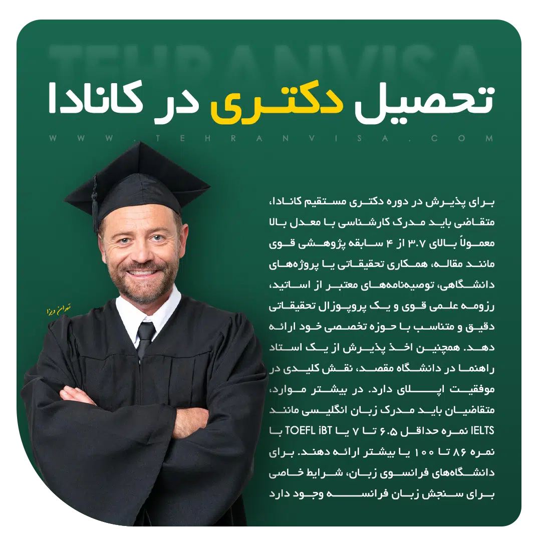برای مهاجرت تحصیلی به کانادا در مقطع دکتری، متقاضیان باید دارای مدرک کارشناسی ارشد معتبر، نمرات بالا در آزمون‌های زبان انگلیسی یا فرانسوی و پیشنهاد تحقیقاتی قوی باشند. همچنین، هزینه‌های تحصیل در این مقطع معمولاً بین ۴,۰۰۰ تا ۱۹,۰۰۰ دلار کانادا در سال متغیر است و برخی دانشگاه‌ها بورس‌های تحصیلی و کمک‌هزینه‌های پژوهشی ارائه می‌دهند. برای دریافت مشاوره تخصصی و دقیق‌تر، فرم مشاوره رایگان تهران ویزا را تکمیل کنید تا کارشناسان، شما را در مراحل بعدی راهنمایی کنند.