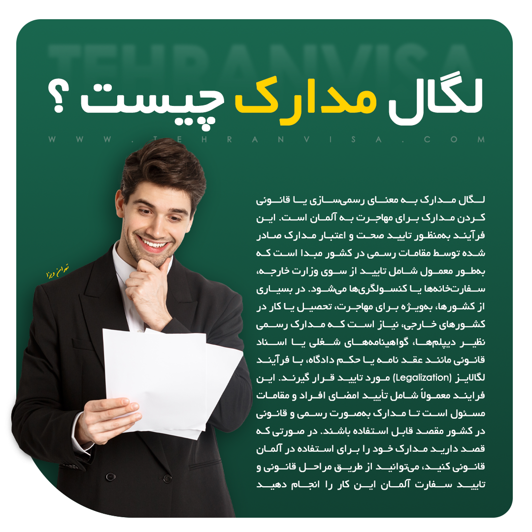 "لگال مدارک آلمان" به معنای رسمیسازی یا قانونی کردن مدارک برای مهاجرت به آلمان است. این فرآیند بهمنظور تایید صحت و اعتبار مدارک صادر شده توسط مقامات رسمی در کشور مبدا است که بهطور معمول شامل تایید از سوی وزارت خارجه، سفارتخانهها یا کنسولگریها میشود. در بسیاری از کشورها، بهویژه برای مهاجرت، تحصیل یا کار در کشورهای خارجی، نیاز است که مدارک رسمی نظیر دیپلمها، گواهینامههای شغلی یا اسناد قانونی مانند عقد نامه یا حکم دادگاه، با فرآیند لگالایز (Legalization) مورد تایید قرار گیرند. این فرایند معمولاً شامل تأیید امضای افراد و مقامات مسئول است تا مدارک بهصورت رسمی و قانونی در کشور مقصد قابل استفاده باشند. در صورتی که قصد دارید مدارک خود را برای استفاده در آلمان قانونی کنید، میتوانید از طریق مراحل قانونی و تایید سفارت آلمان این کار را انجام دهید.