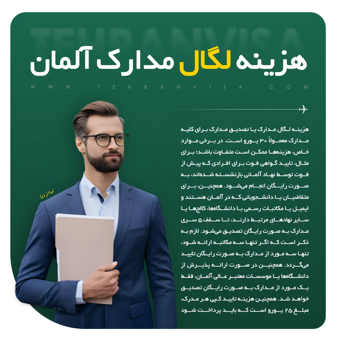 هزینه لگال مدارک یا تصدیق مدارک برای کلیه مدارک معمولاً ۳۰ یورو است. در برخی موارد خاص، هزینهها ممکن است متفاوت باشد؛ برای مثال، تایید گواهی فوت برای افرادی که پیش از فوت توسط نهاد آلمانی بازنشسته شدهاند، به صورت رایگان انجام میشود. همچنین، برای متقاضیان یا دانشجویانی که در آلمان هستند و ایمیل یا مکاتبات رسمی با دانشگاهها، کالجها یا سایر نهادهای مرتبط دارند، تا سقف ۵ سری مدارک به صورت رایگان تصدیق میشود. لازم به ذکر است که اگر تنها سه مکاتبه ارائه شود، تنها سه مورد از مدارک به صورت رایگان تایید میگردد. همچنین در صورت ارائه پذیرش از دانشگاهها یا موسسات معتبر عالی آلمان، فقط یک مورد از مدارک به صورت رایگان تصدیق خواهد شد. همچنین هزینه تایید کپی هر مدرک، 25 یورو است که باید پرداخت شود.