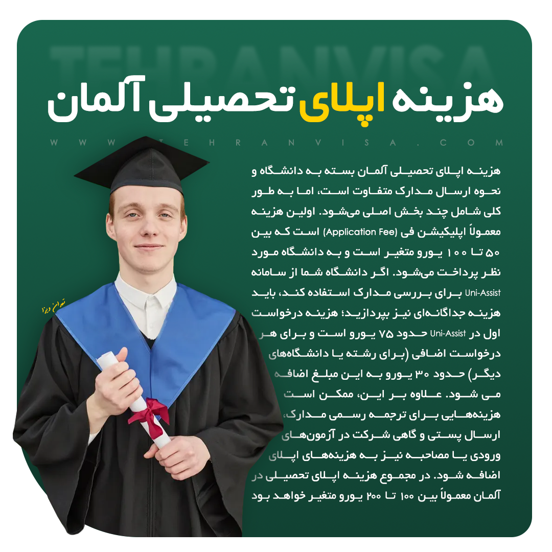 هزینه اپلای تحصیلی آلمان بسته به دانشگاه و نحوه ارسال مدارک متفاوت است، اما به طور کلی شامل چند بخش اصلی میشود. اولین هزینه معمولاً اپلیکیشن فی (Application Fee) است که بین ۵۰ تا ۱۰۰ یورو متغیر است و به دانشگاه مورد نظر پرداخت میشود. اگر دانشگاه شما از سامانه Uni-Assist برای بررسی مدارک استفاده کند، باید هزینه جداگانهای نیز بپردازید؛ هزینه درخواست اول در Uni-Assist حدود ۷۵ یورو است و برای هر درخواست اضافی (برای رشته یا دانشگاههای دیگر) حدود ۳۰ یورو به این مبلغ اضافه میشود. علاوه بر این، ممکن است هزینههایی برای ترجمه رسمی مدارک، ارسال پستی و گاهی شرکت در آزمونهای ورودی یا مصاحبه نیز به هزینههای اپلای آلمان اضافه شود. بنابراین، در مجموع هزینه اپلای تحصیلی در آلمان معمولاً بین ۱۰۰ تا ۲۰۰ یورو متغیر خواهد بود.