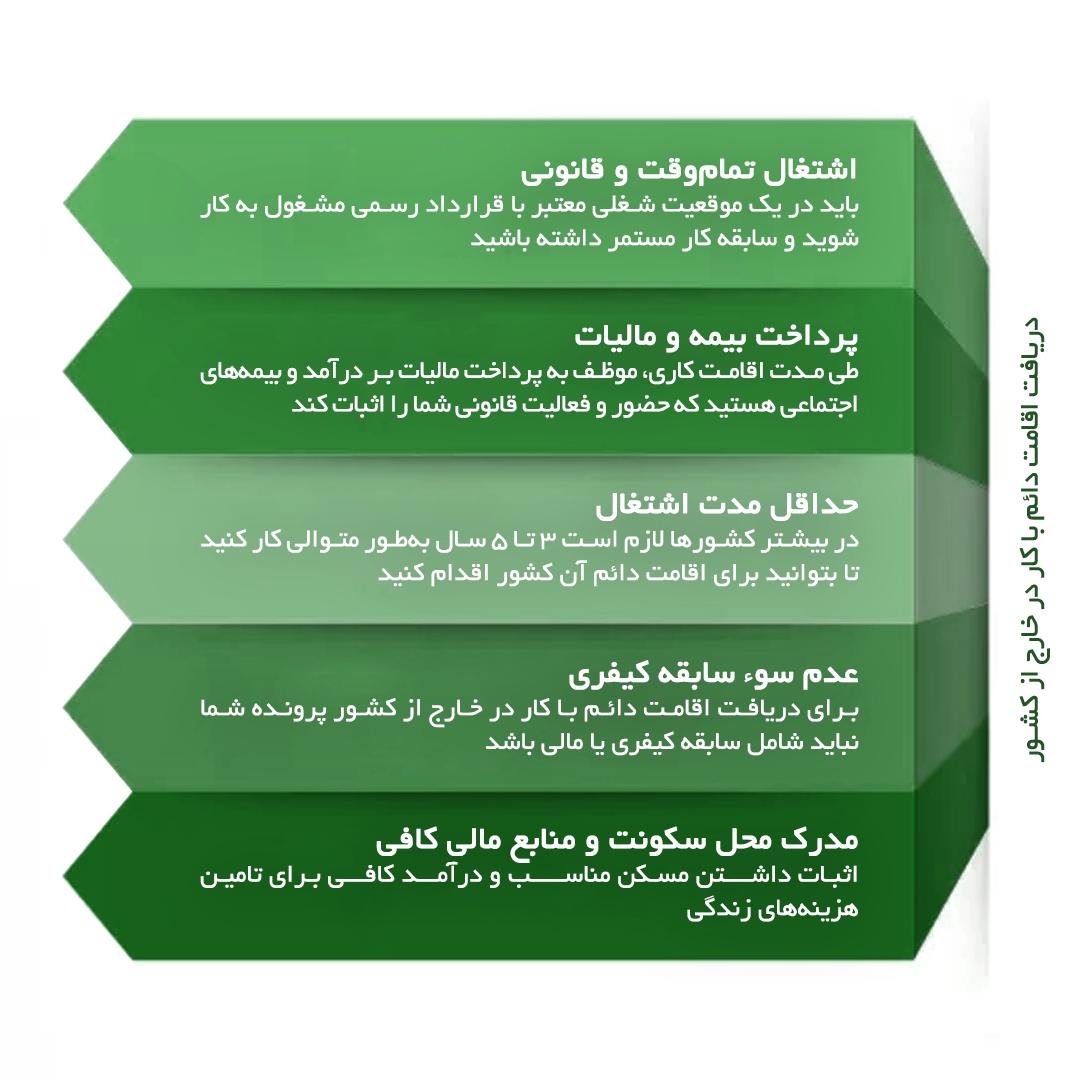 • حداقل مدت اشتغال در بیشتر کشورها لازم است ۳ تا ۵ سال به‌طور متوالی کار کنید تا بتوانید برای اقامت دائم آن کشور اقدام کنید.
