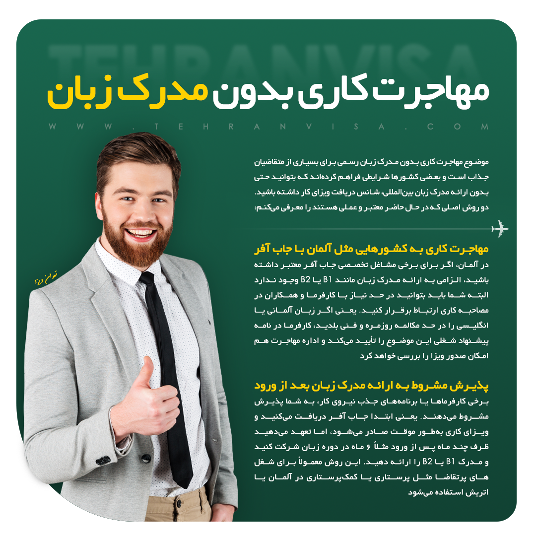 موضوع مهاجرت کاری بدون مدرک زبان رسمی برای بسیاری از متقاضیان جذاب است و خوشبختانه بعضی کشورها شرایطی فراهم کرده‌اند که بتوانید حتی بدون ارائه مدرک زبان بین‌المللی، شانس دریافت ویزای کار داشته باشید. در ادامه دو روش برای مهاجرت بدون مدرک زبان از طریق کار ذکر شده است: