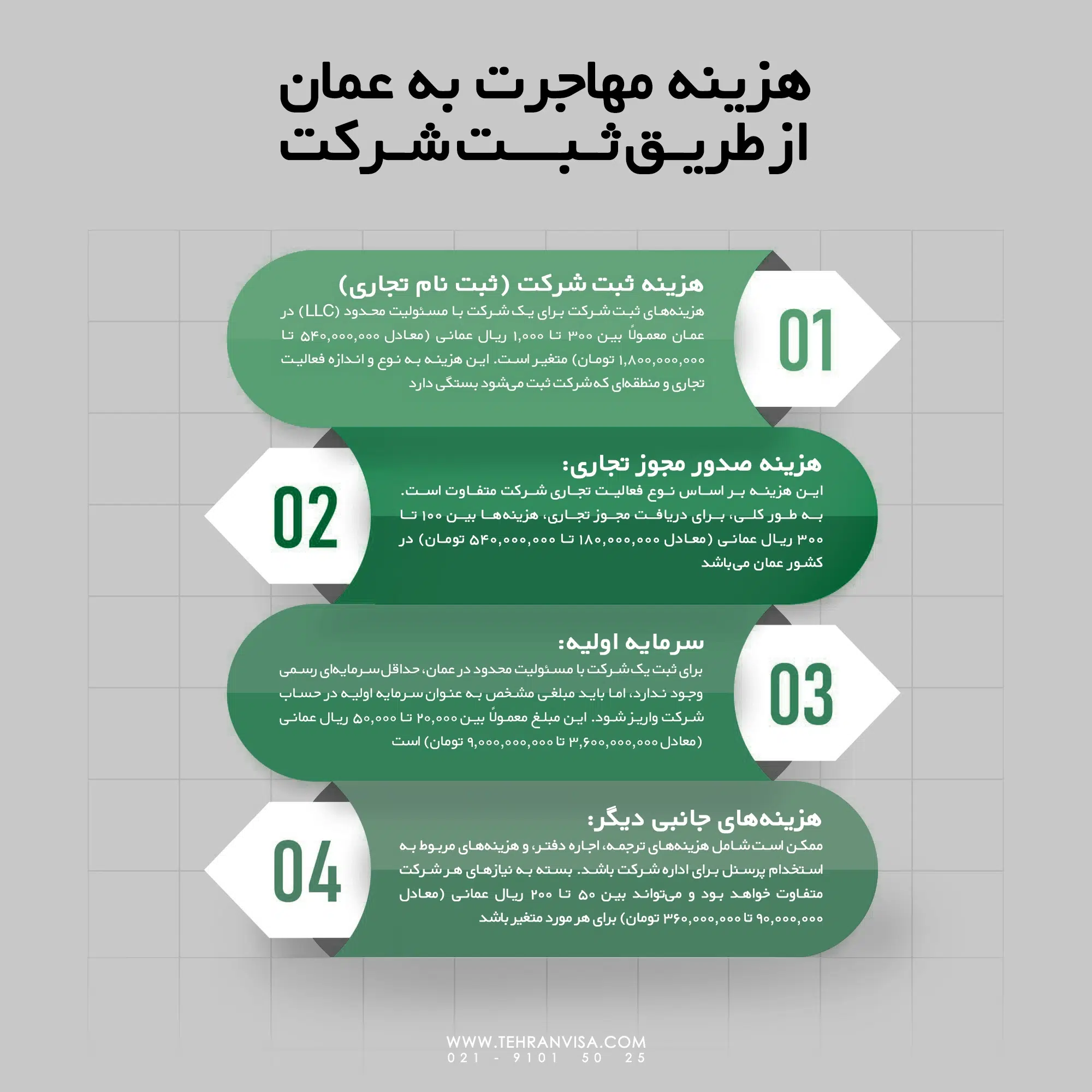 - ثبت شرکت: حداقل سرمایه لازم برای ثبت یک شرکت با مسئولیت محدود حدود ۱۵۰ هزار ریال عمانی است. در برخی موارد برای شرکتهای خارجی این مبلغ تا ۱ میلیون ریال عمانی نیز افزایش مییابد. هزینههای اداری ثبت و دریافت اقامت نیز حدود ۹۰۰ ریال عمانی برآورد میشود.