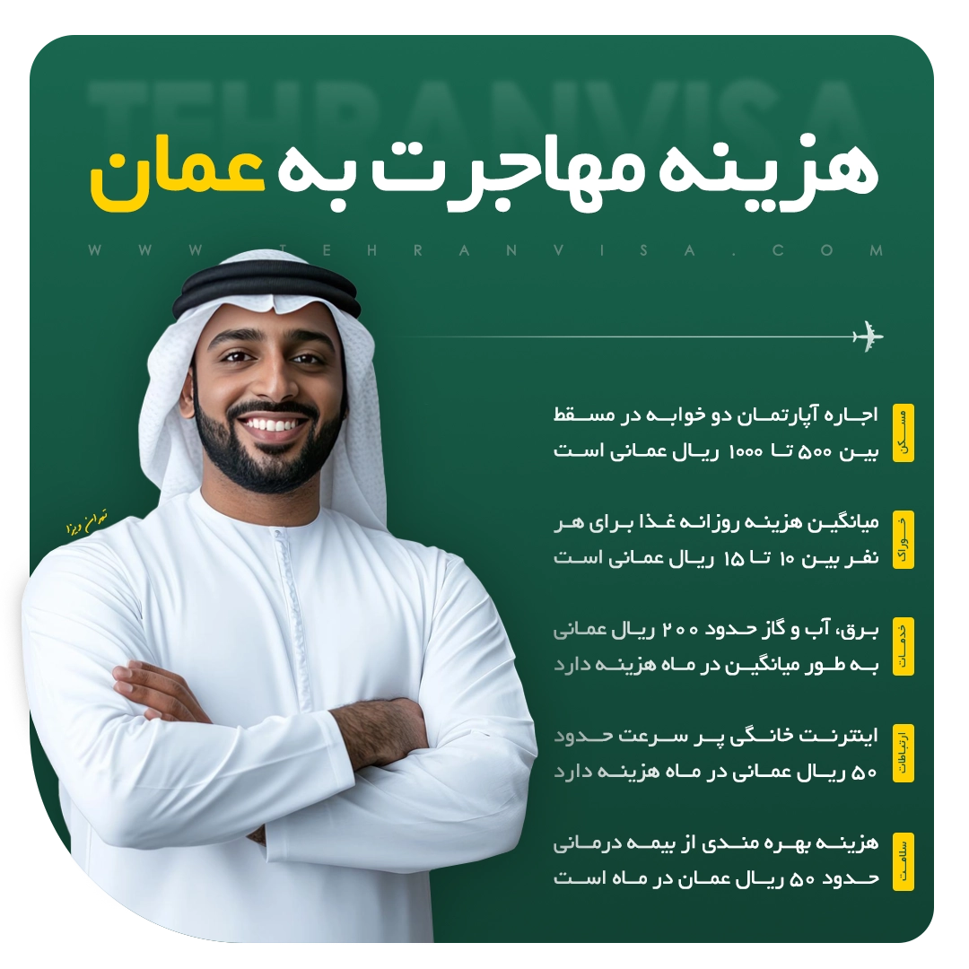 - مهاجرت تحصیلی: هزینه ویزای تحصیلی معمولاً بین ۲۰ تا ۳۰ ریال عمانی است. علاوه بر آن باید شهریه دانشگاه (بهطور میانگین بین ۳۰۰۰ تا ۶۰۰۰ ریال عمانی در سال بسته به رشته و مقطع) و بیمه درمانی دانشجویی را در نظر گرفت.