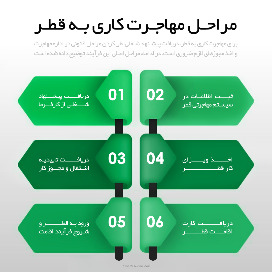 برای مهاجرت کاری به قطر، دریافت پیشنهاد شغلی، طی کردن مراحل قانونی در اداره مهاجرت و اخذ مجوزهای لازم ضروری است. در ادامه، مراحل اصلی این فرآیند توضیح داده شده است.