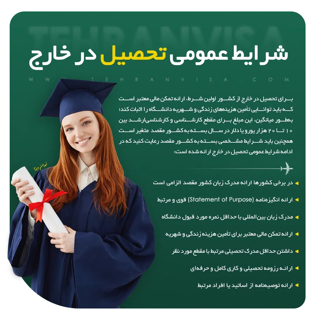 برای تحصیل در خارج از کشور اولین شرط، ارائه تمکن مالی معتبر است که باید توانایی تأمین هزینههای زندگی و شهریه دانشگاه را اثبات کند؛ بهطور میانگین، این مبلغ برای مقطع کارشناسی و کارشناسیارشد بین ۱۰ تا ۲۰ هزار یورو یا دلار در سال (بسته به کشور مقصد) متغیر است. همچنین باید شرایط مشخصی بسته به کشور مقصد رعایت کنید که در ادامه شرایط عمومی تحصیل در خارج ارائه شده است: