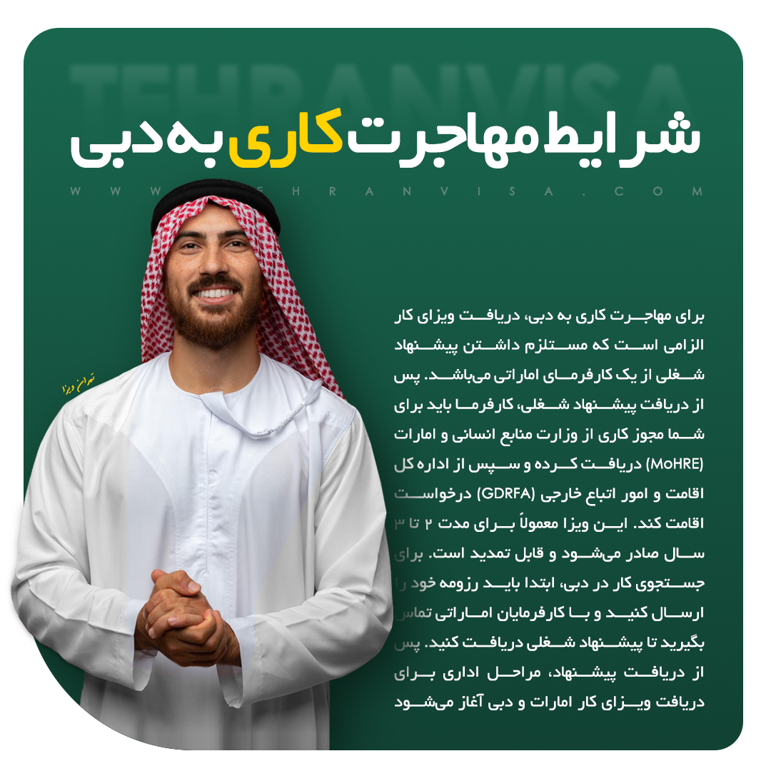 برای مهاجرت کاری به دبی، دریافت ویزای کار الزامی است که مستلزم داشتن پیشنهاد شغلی از یک کارفرمای اماراتی میباشد. پس از دریافت پیشنهاد شغلی، کارفرما باید برای شما مجوز کاری از وزارت منابع انسانی و امارات (MoHRE) دریافت کرده و سپس از اداره کل اقامت و امور اتباع خارجی (GDRFA) درخواست اقامت کند. این ویزا معمولاً برای مدت ۲ تا ۳ سال صادر میشود و قابل تمدید است. برای جستجوی کار در دبی، ابتدا باید رزومه خود را ارسال کنید و با کارفرمایان اماراتی تماس بگیرید تا پیشنهاد شغلی دریافت کنید. پس از دریافت پیشنهاد، مراحل اداری برای دریافت ویزای کار آغاز میشود. شرایط کلی مهاجرت به امارات از طریق کار شامل موارد زیر است: