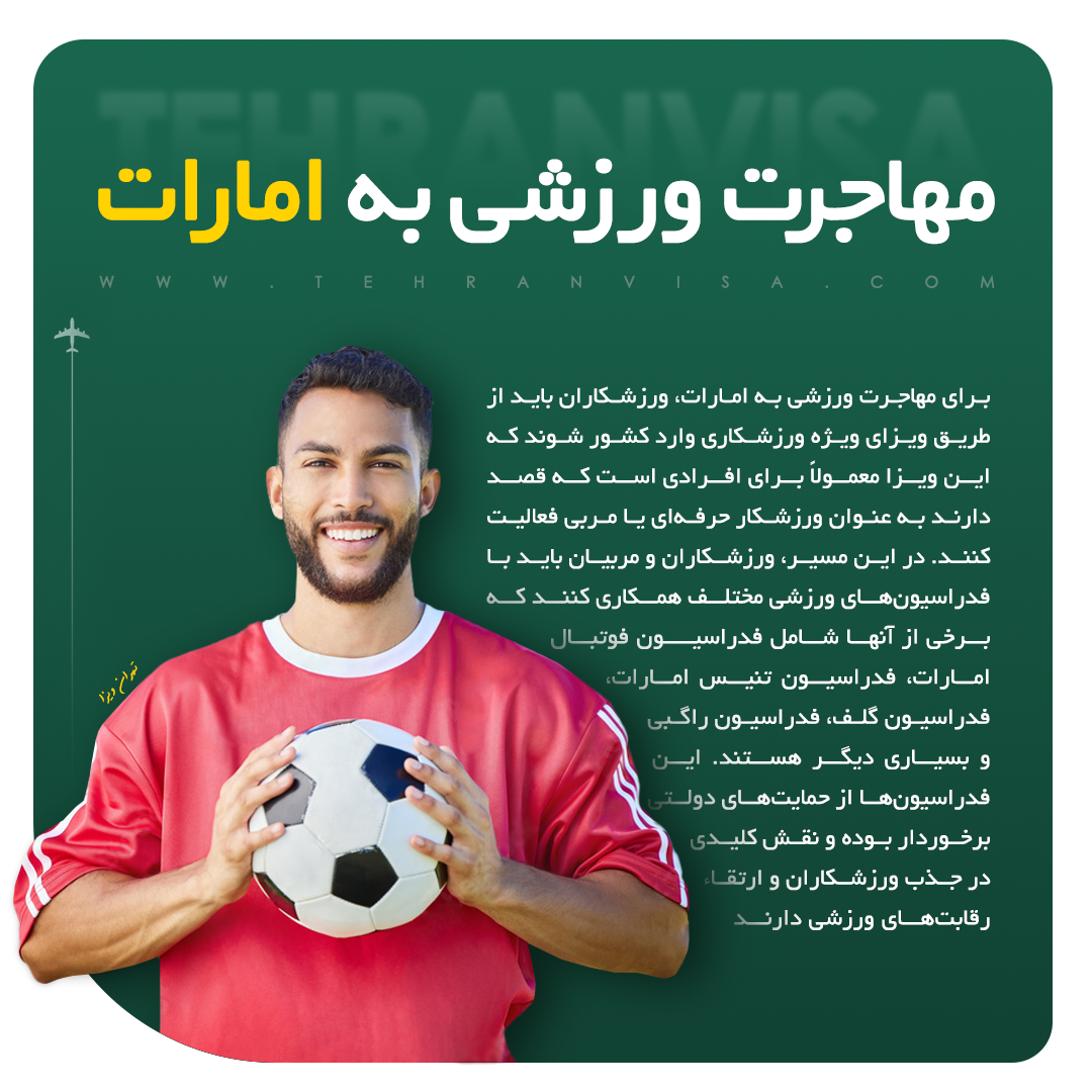 برای مهاجرت ورزشی به امارات، ورزشکاران باید از طریق ویزای ویژه ورزشکاری وارد کشور شوند که این ویزا معمولاً برای افرادی است که قصد دارند به عنوان ورزشکار حرفهای یا مربی فعالیت کنند. در این مسیر، ورزشکاران و مربیان باید با فدراسیونهای ورزشی مختلف همکاری کنند که برخی از آنها شامل فدراسیون فوتبال امارات، فدراسیون تنیس امارات، فدراسیون گلف، فدراسیون راگبی و بسیاری دیگر هستند. این فدراسیونها از حمایتهای دولتی برخوردار بوده و نقش کلیدی در جذب ورزشکاران و ارتقاء رقابتهای ورزشی دارند.